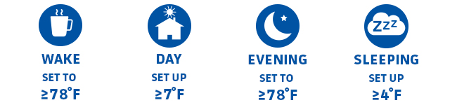 Set your thermostat to the highest temperature you can tolerate. The recommended setting is 78° or higher when you are home, and even higher when you are asleep or away.